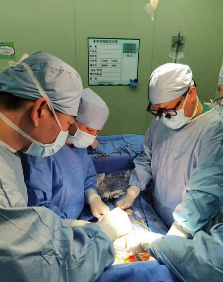 普外科主任崔云甫教授(右)和膽胰外科蘇志雷副教授(左2)應用經(jīng)肝臟動脈灌注驅(qū)血技術完成