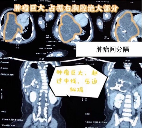 一周前,小彤彤因?yàn)闅獯?、呼吸困難、惡心在當(dāng)?shù)蒯t(yī)院就診,胸片檢查提示隔膨升可能,為了明確診斷來(lái)到哈爾濱市兒童醫(yī)院心胸外科就診。戚家峰副主任為孩子進(jìn)一步進(jìn)行查體考慮是縱隔腫瘤,通過(guò)胸部CT增強(qiáng)造影檢查更加清晰的看到腫瘤的特殊性,該腫瘤幾乎占滿(mǎn)右側(cè)胸腔,縱隔被擠壓后導(dǎo)致移位,心臟、食管均有不同程度的受壓影響。而且這個(gè)巨大的腫瘤由很多分隔組成,分隔中含有的物質(zhì)又不同,有囊性組織、實(shí)性組織和鈣化組織,考慮畸胎瘤可能。
