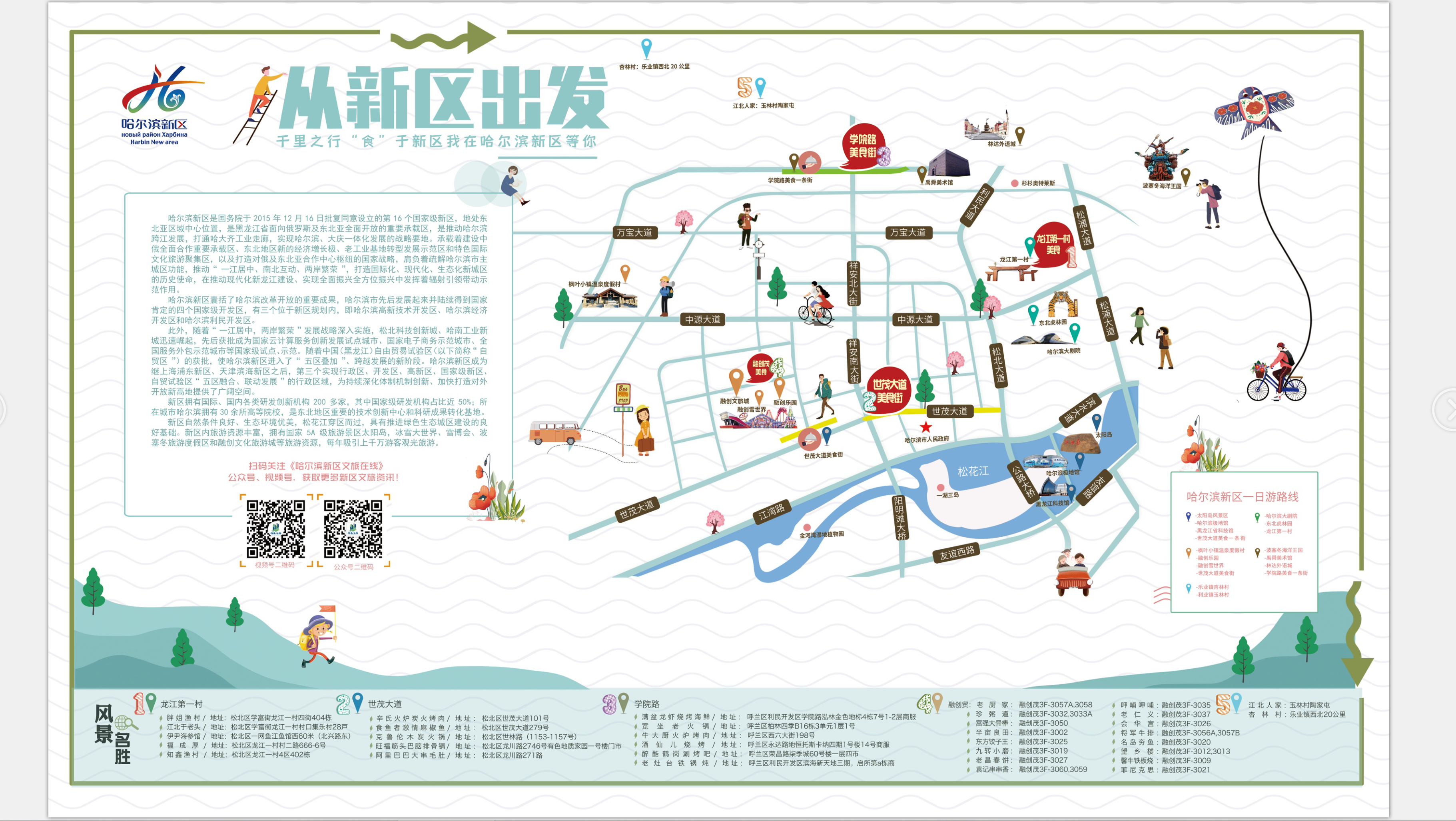 《哈爾濱新區(qū)美食地圖》以新區(qū)特色美食為主題,突出“美食+旅游”的特色結(jié)合,旨在為游客推薦新區(qū)多種多樣的優(yōu)質(zhì)美景美食,在豐富游客度假體驗(yàn)的同時,叫響本土美食品牌,并推出五條“美食+”旅游度假一日游路線。通過《哈爾濱新區(qū)美食地圖》,市民和游客可以一站式了解新區(qū)的“吃住游娛購”。