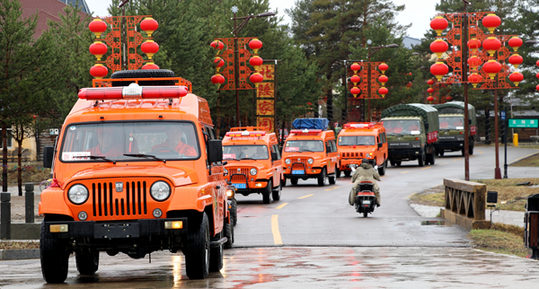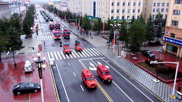 在漠河市城區(qū)主要街道,由防火指揮車、防火宣傳車、防火運兵車等33臺車輛組成的反思巡游車隊,長鳴防火警報,繞市區(qū)緩慢行駛,通過聲勢浩大的宣傳,警醒廣大居民群眾以史為鑒,深刻反思“五?六”火災(zāi)帶來的慘痛教訓(xùn),讓森林防火時刻深入人心,嚴(yán)防森林火災(zāi)發(fā)生。在漠河市區(qū)開展巡游活動的同時,各鎮(zhèn)也同步組織開展了規(guī)模不同的“五·六”反思警示教育活動。
