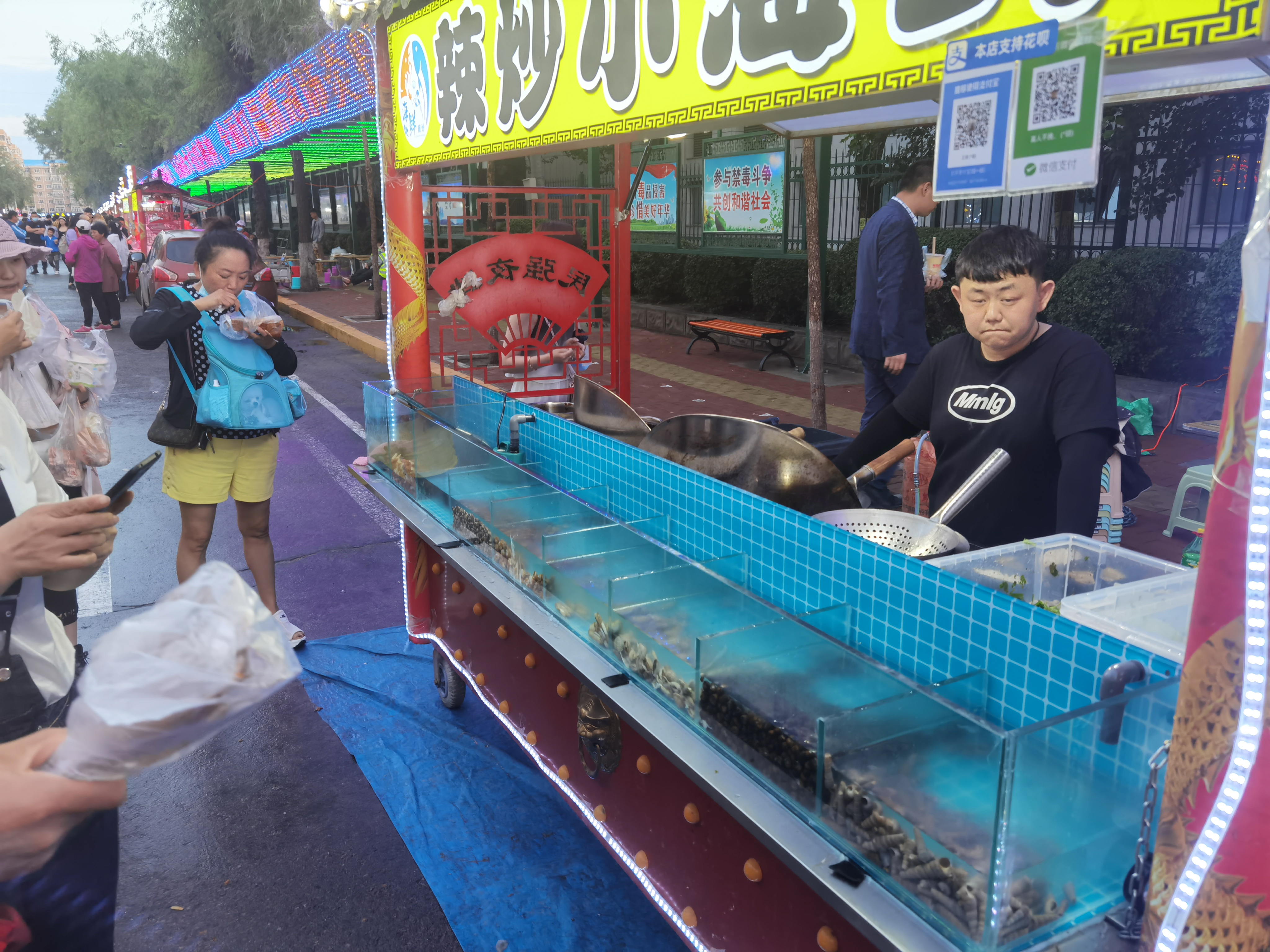 民強(qiáng)夜市位于民強(qiáng)大街深處,兩頭被柵欄堵住,內(nèi)部擺放攤車全部都是制式的,古香古色,燈飾璀璨。在一家“辣炒小海鮮”攤車前,記者看到這樣一幕:車體前部竟是一排玻璃水箱,里面養(yǎng)著各種新鮮海貨,車體后部放著锃亮的炒勺,你選好的海貨攤主直接撈出炒制。