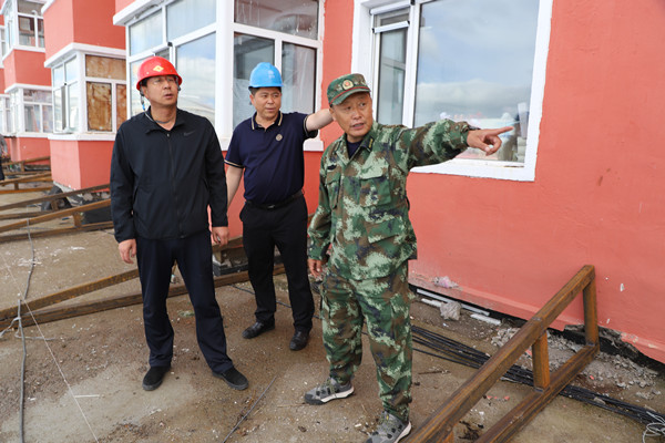 林業(yè)局黨委副書(shū)記、局長(zhǎng)韓鳳泉(左一)登上莓苑小區(qū)3號(hào)樓,了解安裝鐵皮瓦防止一樓漏水情況。