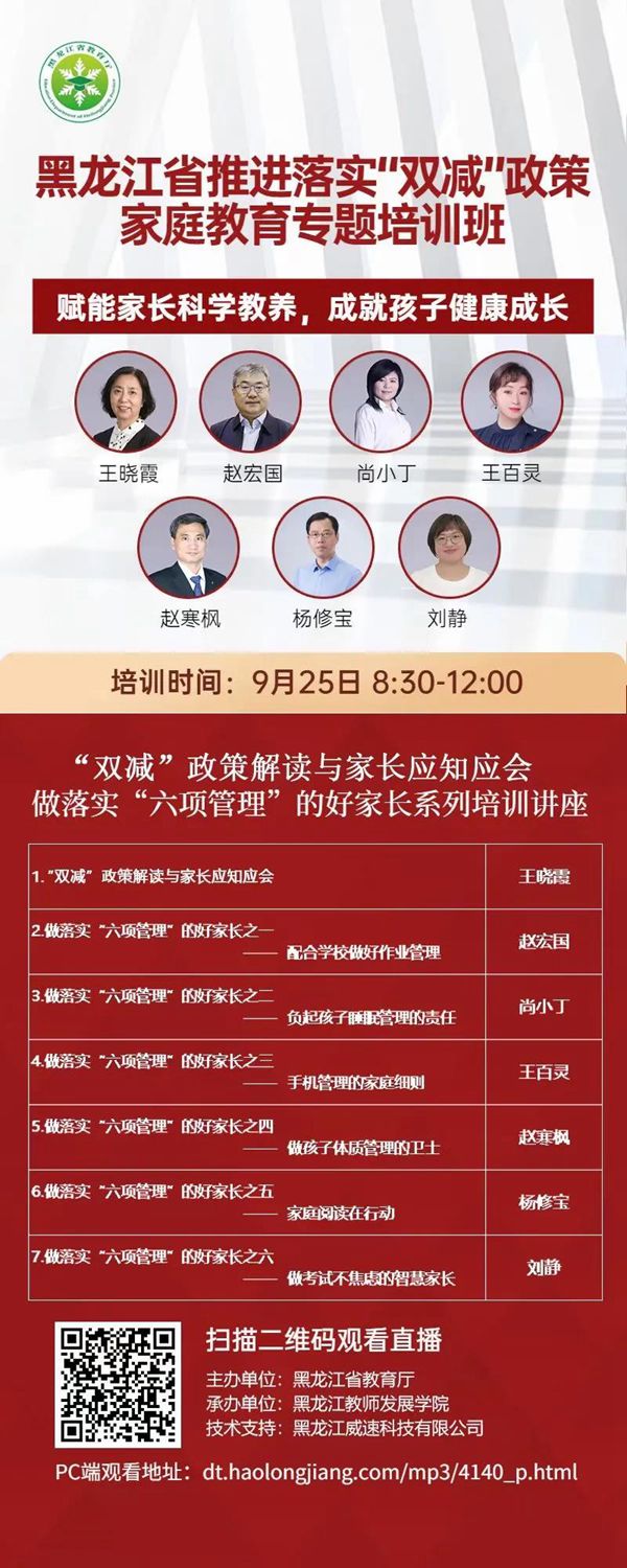 據(jù)了解,此次培訓是《黑龍江省中小學“百萬家庭賦能”工程實施方案》重要組成部分,也是省教育廳踐行黨史學習教育“我為群眾辦實事”,解決群眾急難愁盼問題的具體舉措,由省教育廳主辦、黑龍江教師發(fā)展學院承辦,基礎教育處處長領銜六位家庭教育專家共同開講,時長三個半小時,受到廣大家長的一致好評,取得良好的社會反響,直播時瀏覽峰值達到210.7萬人次。培訓內(nèi)容緊緊圍繞廣大家長們“雙減”形勢下的困惑,深入宣傳“雙減”政策和年初以來教育部相繼下發(fā)的關于手機、作業(yè)、睡眠、讀物、體質(zhì)、考試等“六項管理”文件內(nèi)容,分七個專題進行深入細致的家庭教育指導,有的放矢地解答家長“心中所疑”、化解家長“心中所急”,很多家長通過家庭學校群進行交流,有的家長反饋道:“通過觀看直播我們家長深刻體會到一定要以身作則,在孩子面前少玩手機,多陪孩子閱讀書籍,多讓孩子進行戶外活動?!庇械募议L則表示,聽了講座深刻理解了孩子成長的根基深植于家庭教育的道理,家庭教育才是孩子的起跑線,主動地配合學校落實“雙減”政策,從做好“六項管理”入手科學優(yōu)化家庭教養(yǎng)方式,減少孩子的校外培訓和作業(yè)負擔,還給孩子一個幸福的童年,做一名智慧家長。
