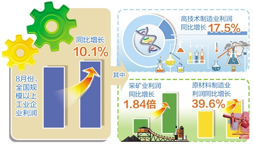 8月份,采礦業(yè)、原材料制造業(yè)利潤同比分別增長1.84倍、39.6%,均明顯高于規(guī)模以上工業(yè)平均水平;兩年平均分別增長58.1%、36.0%,增速較上月分別加快24.0個和4.4個百分點。其中,受大宗商品價格總體高位運行推動,煤炭行業(yè)利潤同比增長2.41倍,增速較上月加快30.0個百分點;油氣開采行業(yè)利潤同比增長2.57倍;有色、化工行業(yè)利潤分別增長98.9%、66.5%。