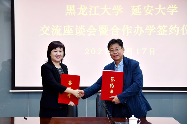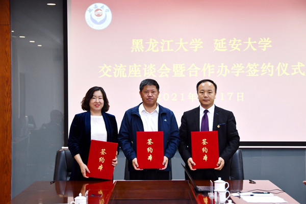 黑龍江大學(xué)于文秀副校長與延安大學(xué)呂達(dá)副校長共同簽署學(xué)校層面合作辦學(xué)框架協(xié)議書。黑龍江大學(xué)俄語學(xué)院黨委書記黃東晶、經(jīng)濟(jì)與工商管理學(xué)院院長常樹春與延安大學(xué)經(jīng)濟(jì)與管理學(xué)院院長王進(jìn)共同簽署合作備忘錄。黑龍江大學(xué)馬克思主義學(xué)院黨總支書記王培軍與延安大學(xué)馬克思主義學(xué)院黨委常務(wù)副書記張彬簽署合作備忘錄。隨后,雙方圍繞教學(xué)科研平臺進(jìn)行座談交流。