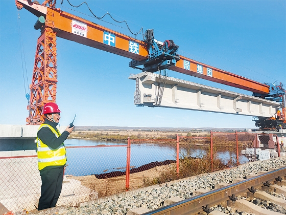 據(jù)介紹,前不久北黑鐵路升級改造工程新建24座鐵路橋中的另一座孫吳段大河口中橋架梁已經(jīng)完成。橋梁位于孫吳縣境內(nèi),橋長112.73米,孔跨布置為3×32米,下部結(jié)構(gòu)和T梁預制施工由中鐵十局完成,梁體架設由中鐵十六局集團第五工程有限公司負責完成。