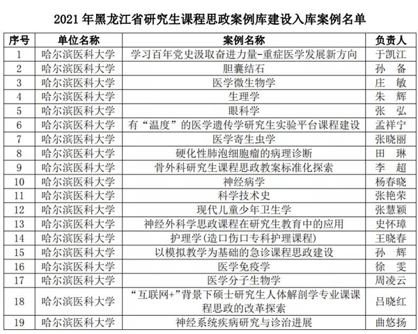 黑龍江經(jīng)濟(jì)網(wǎng)訊(黑龍江日?qǐng)?bào)全媒體見習(xí)記者董廣碩 商祺)為貫徹落實(shí)國家《關(guān)于全面落實(shí)研究生導(dǎo)師立德樹人職責(zé)的意見》《高等學(xué)校課程思政建設(shè)指導(dǎo)綱要》《關(guān)于加快新時(shí)代研究生教育改革發(fā)展的意見》精神,按照《關(guān)于加快新時(shí)代黑龍江省研究生教育改革發(fā)展的實(shí)施意見》要求,日前,經(jīng)全省研究生培養(yǎng)單位遴選推薦,黑龍江省研究生課程思政教育聯(lián)盟專家委員會(huì)評(píng)審,省學(xué)位委員會(huì)、省教育廳批準(zhǔn),哈爾濱醫(yī)科大學(xué)共有26個(gè)項(xiàng)目獲批省級(jí)立項(xiàng),其中研究生課程思政課程建設(shè)項(xiàng)目4個(gè)、研究生導(dǎo)學(xué)思政團(tuán)隊(duì)(導(dǎo)師)建設(shè)項(xiàng)目2個(gè)、研究生課程思政案例19個(gè),慶祝建黨100周年巡展優(yōu)秀研究生導(dǎo)師團(tuán)隊(duì)1支。