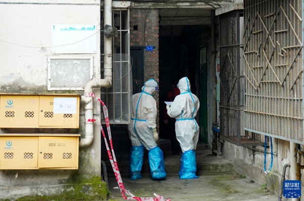 11月4日,在重慶九龍坡區(qū)九龍街道,兩名身穿防護(hù)服的青年志愿者準(zhǔn)備入戶核對(duì)信息。
