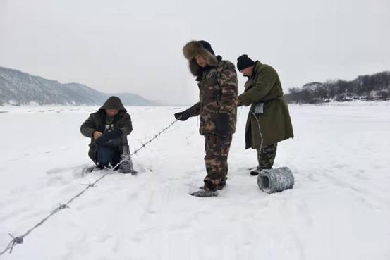 為進一步做好防境外疫情輸入工作,最大限度的保護好人民群眾的生命健康安全,當地政府決定在界江沿線架設防疫隔離墻,阻擋境外物種帶入病毒。紅星林場在接到任務后,迅速組織人力物力投入戰(zhàn)斗。冰封的江面在冬季暗藏危機,看似一平如鏡的冰下有很多封凍時形成的漏斗,白雪覆蓋下的區(qū)域更是潛藏著無數的冰縫,一腳踏進去就會造成嚴重的扭傷,而在冰面上放線拉網需要每天抬著幾十斤的鐵蒺藜線軸往返十幾里路程,行進在冰面路段上一步一滑,加固鐵線時還要時刻小心不被鐵蒺藜劃傷,鉆孔、插樁也要時刻防止產生大面積的冰裂。