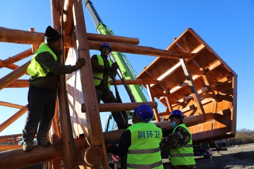 阿木爾林業(yè)局環(huán)衛(wèi)隊(duì)黨員干部職工正在安裝薩布素軍馬場(chǎng)大門(王力 攝)