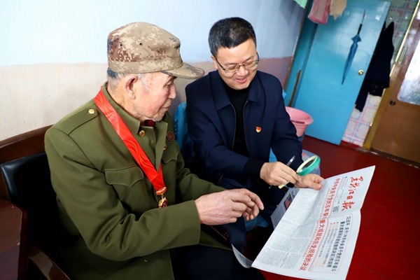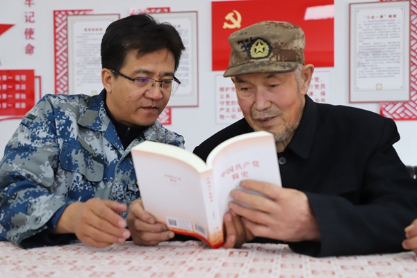 阿木爾林業(yè)局黨委委員、組織部部長王立昆與退休老黨員張俊峰共同學習黨史(王力 攝)