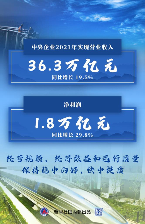 2021年,中央企業(yè)完成固定資產(chǎn)投資(不含房地產(chǎn))3.2萬億元,同比增長10.1%;上繳稅費(fèi)2.4萬億元,同比增長20%;截至去年末中央企業(yè)資產(chǎn)負(fù)債率保持在64.9%,圓滿完成預(yù)期目標(biāo)。
