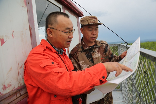 孫立森在向長山林場黨支部書記關(guān)大安介紹塔周圍的地形、地勢、河流等特點,以及周邊瞭望塔的分布情況(王力 攝)