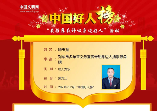 騰玉龍,鐵力市人,曾先后榮獲“龍江好人”“伊春好人”“最美鐵力人”等榮譽稱號。他曾多次捐贈造血干細胞,挽救了3個人的生命。在他的帶動下,他的家庭成為中國首個眼角膜、身體器官和造血干細胞捐獻志愿者家庭。騰玉龍同志入選2021年12月“中國好人榜”后,鐵力市精心組織策劃,動員廣大干部群眾為典型點贊助力,組織全市各單位、各社區(qū)居民學(xué)習(xí)“中國好人”先進事跡。