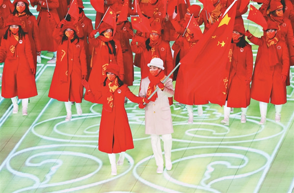 中國(guó)代表團(tuán)旗手高亭宇(右)。 新華社記者 徐子鑒攝