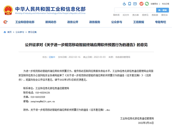 據(jù)工信部網(wǎng)站16日消息,工信部公開征求對《關(guān)于進一步規(guī)范移動智能終端應(yīng)用軟件預(yù)置行為的通告》的意見?!锻ǜ妗诽岢?,生產(chǎn)企業(yè)應(yīng)確保除基本功能軟件外的預(yù)置應(yīng)用軟件均可卸載,并提供安全便捷的卸載方式供用戶選擇。全文如下:
