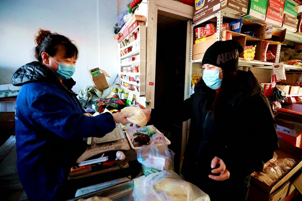 阿木爾林業(yè)局周周蔬菜水果店經(jīng)營業(yè)戶周麗霞(左)向客戶銷售“依林河手搟面”(王力 攝)
