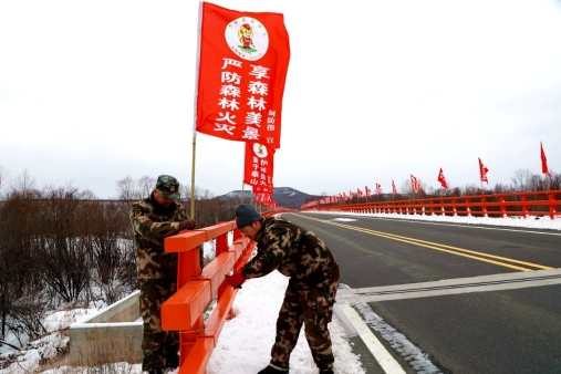 紅旗林場職工在京漠公路2410公里處的阿木爾河大橋安裝防火宣傳彩旗(王力 攝)