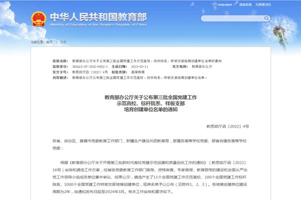 根據(jù)《教育部辦公廳關(guān)于開展第三批新時代高校黨建示范創(chuàng)建和質(zhì)量創(chuàng)優(yōu)工作的通知》(教思政廳函〔2021〕16號)安排,經(jīng)省級黨委教育工作部門推薦、專家評審等環(huán)節(jié),教育部遴選產(chǎn)生了11個全國黨建工作示范高校、100個全國黨建工作標(biāo)桿院系、1000個全國黨建工作樣板支部培育創(chuàng)建單位。各培育創(chuàng)建單位建設(shè)周期為2年,自通知發(fā)布日起至2024年3月。