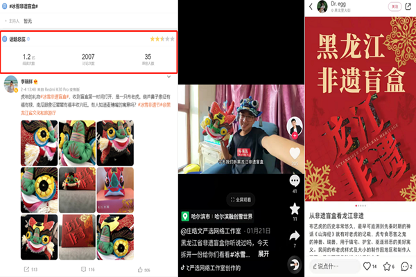 該項活動由哈爾濱品趣文化傳媒有限公司承辦,新華網(wǎng)、東北網(wǎng)、騰訊、今日頭條等媒體進行了報道,累計報道30余次;獲微博、抖音、小紅書等平臺KOL、KOC參與轉(zhuǎn)發(fā);微博#冰雪非遺盲盒#話題曝光量超1.2億人次;抖音、小紅書等平臺曝光量約20萬人次。