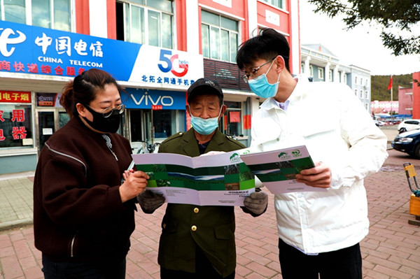 阿木爾林業(yè)局工作人員零距離向職工群眾解答森林認(rèn)證概念、流程、目的等相關(guān)問(wèn)題(王力 攝)