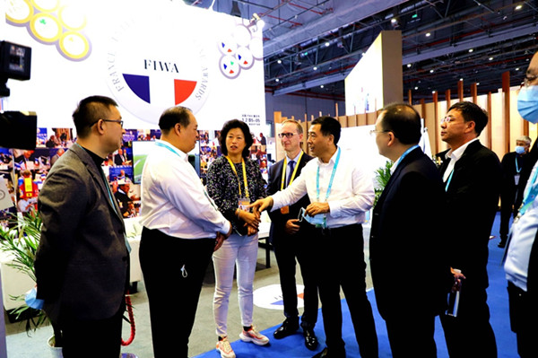 阿木爾林業(yè)局北極冰藍(lán)莓酒莊生產(chǎn)的冰酒、紅酒等產(chǎn)品,在第四屆上海國(guó)際進(jìn)出口博覽會(huì)上展出。大興安嶺林業(yè)集團(tuán)公司黨委副書(shū)記、總經(jīng)理李軍(左五)與國(guó)際友人及林業(yè)局參展人員親切交談,了解酒莊產(chǎn)品特點(diǎn)、市場(chǎng)營(yíng)銷等情況(王力 攝)
