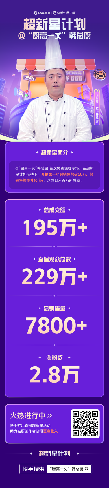 前不久,快手美食主播“廚高一丈韓總廚”(快手ID:hanzhongchu666888)參加了快手官方舉辦的“超新星計劃”,開啟付費(fèi)課程直播專場,最終取得總成交額195萬+,總銷售量7800+的亮眼成績。