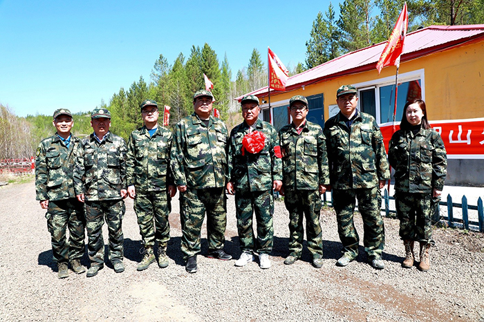 阿木爾林業(yè)局、依東林場(chǎng)領(lǐng)導(dǎo)干部與即將退休的共產(chǎn)黨員、管護(hù)員滿(mǎn)德江合影。(王力 攝)