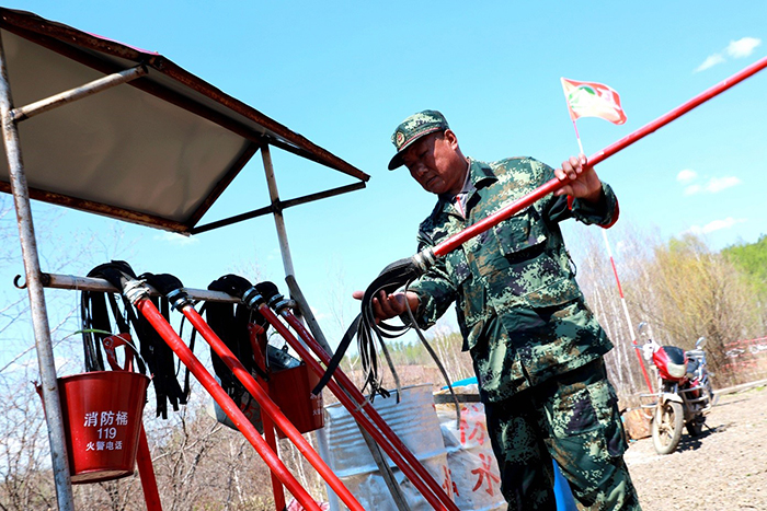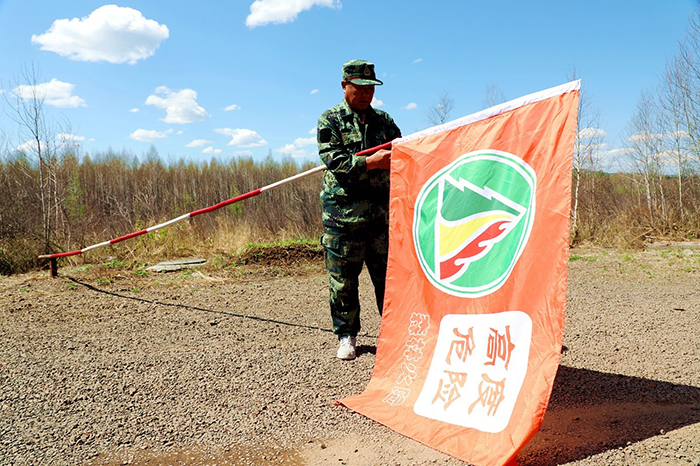 共產(chǎn)黨員、管護(hù)員滿(mǎn)德江站好最后一班崗,準(zhǔn)備升防火預(yù)警旗。(王力 攝)