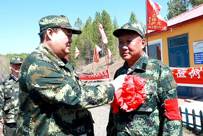 阿木爾林業(yè)局黨委書(shū)記胡守慶(左)為依東林場(chǎng)即將退休的共產(chǎn)黨員、管護(hù)員滿(mǎn)德江(右)戴上“光榮花”。(王力 攝)