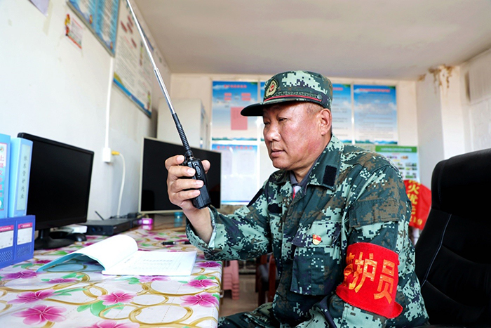 共產(chǎn)黨員、管護(hù)員滿(mǎn)德江在向阿防指匯報(bào)工作情況。(王力 攝)