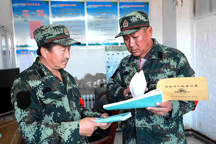 共產(chǎn)黨員、管護(hù)員滿(mǎn)德江叮囑“戰(zhàn)友”張振東把記錄本記好。(王力 攝)