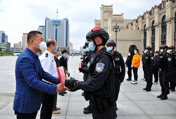 公益活動首批慰問對象是剛從抗疫一線歸來的哈爾濱市公安局巡特警支隊隊員。本次疫情期間,他們馳援五常市拉林鎮(zhèn)、哈爾濱市平房區(qū)和賓縣,先后核查車輛3700余臺,幫助群眾1100多人,為群眾配送餐食10萬余份、飲用水20余萬瓶、防疫物資9000余件,用血肉身軀筑起了抗擊疫情的鋼鐵長城,詮釋了“疫情當前,特警在先”的使命擔當?!案兄x黑龍江日報報業(yè)集團和愛心企業(yè)送來健康產品。今后我們會一如繼往做好本職工作,哪里需要哪里上,當好人民的忠誠衛(wèi)士?!苯舆^“小綠君”,哈爾濱市公安局巡特警支隊特警一大隊二中隊教導員劉甲洲一臉幸福。
