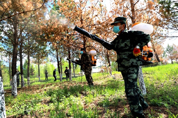 阿木爾林業(yè)局病防站利用噴霧噴粉機(jī)近距離對(duì)樟子松綠化樹木進(jìn)行病蟲害防治(王力 攝)