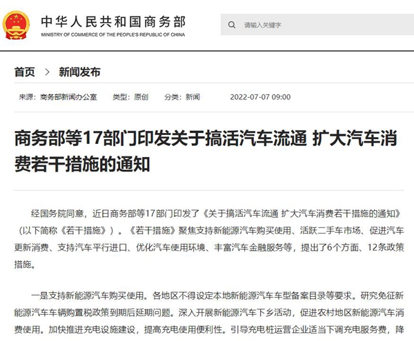 日前,商務(wù)部等17部門印發(fā)了《關(guān)于搞活汽車流通 擴(kuò)大汽車消費(fèi)若干措施的通知》,《措施》聚焦支持新能源汽車購買使用、活躍二手車市場、促進(jìn)汽車更新消費(fèi)、支持汽車平行進(jìn)口、優(yōu)化汽車使用環(huán)境、豐富汽車金融服務(wù)等,提出了6個(gè)方面、12條政策措施。