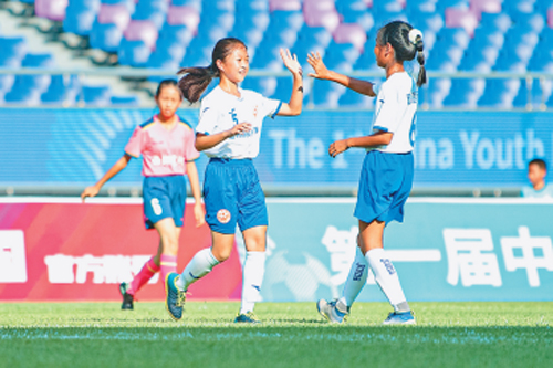 7月10日,在第一屆中國青少年足球聯(lián)賽(浙江賽區(qū))女子小學(xué)U12組比賽中,杭州長陽小學(xué)的小球員彭紫萱(中)進(jìn)球后與隊(duì)友鄧語菲擊掌慶祝。