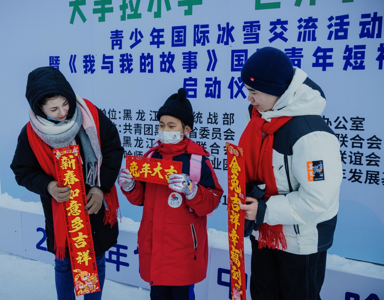 當(dāng)天上午,在雪博會(huì),來自黑龍江大學(xué)的各國留學(xué)生代表與中國青少年結(jié)對(duì)互動(dòng),互贈(zèng)新春禮物,表達(dá)對(duì)即將迎來的兔年美好祝福。中外青少年小手拉大手,共游太陽島雪博會(huì),鯉魚躍龍門、圓夢(mèng)啟程、雪冠博覽等雪雕雪景讓大家流連忘返。世界各國青少年一起雕刻“宇航員”雪雕,送上春聯(lián)祝福語,體驗(yàn)了中國傳統(tǒng)文化和濃濃的年味,表達(dá)了對(duì)世界文化共融的美好祝愿。