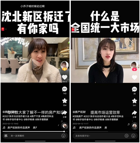 “現(xiàn)在整個沈陽房產(chǎn)市場30%的成交額都是由快手主播提供的,當?shù)氐拈_發(fā)商們也會經(jīng)常和快手平臺、快手主播合作宣傳,平臺對于房產(chǎn)行業(yè)的約束,也帶著當?shù)胤慨a(chǎn)市場向更加正規(guī)化方向發(fā)展”。
