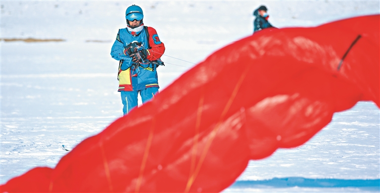 近日,第六屆風(fēng)箏滑雪公開(kāi)賽在松花江上舉行,幾十位選手在白雪皚皚的江上競(jìng)速馳騁。大風(fēng)箏帶著雪板高速駛過(guò),時(shí)不時(shí)濺起朵朵白雪,宛如在雪上“沖浪”。本次比賽地點(diǎn)位于哈爾濱市呼蘭區(qū)附近江面,此處寬闊平坦,且雪質(zhì)佳,極適宜風(fēng)箏滑雪運(yùn)動(dòng)。