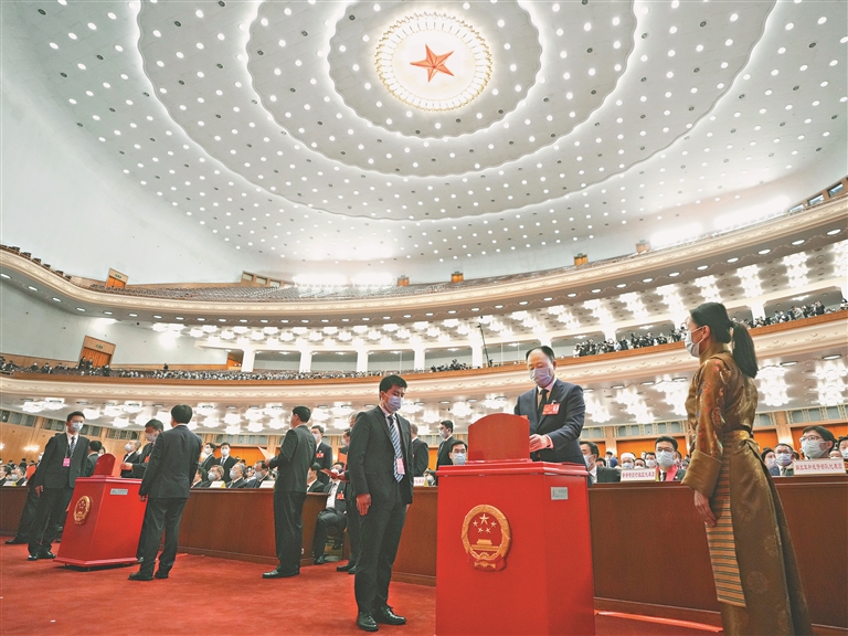 3月10日,十四屆全國(guó)人大一次會(huì)議在北京人民大會(huì)堂舉行第三次全體會(huì)議。這是代表在投票。新華社記者 王毓國(guó)攝