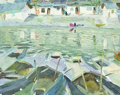 在諶北新的代表性作品里,無論何種結(jié)構(gòu),色調(diào)、筆觸、造型、線條都可以獨(dú)立觀賞。一塊厚堆的白色顏料,可以是云朵、是白墻,或是前后重疊的船帆。用筆的疏密、狀貌和節(jié)奏都有獨(dú)立存在的意義,既可以像欣賞書法用筆一樣拋開物象去體味,又可以去想象和填補(bǔ)與之恰合的物象和自然關(guān)系。諶北新對書法的深入研究和長期的繪畫寫生,以及他對物象、空間、色彩關(guān)系的觀察與創(chuàng)造實(shí)踐,使其作品能夠?qū)⒉煌谋憩F(xiàn)手法有機(jī)地融為一體。比如一筆畫下去,既表現(xiàn)空間層次,也體現(xiàn)厚薄輕重,同時展現(xiàn)光線的微妙變化。這種綜合性的呈現(xiàn)效果,實(shí)際上也契合著中國山水畫所追求的通過用筆的輕重緩急,通過虛實(shí)濃淡的墨色渲染,通過遠(yuǎn)近高低的畫面布局,表現(xiàn)山水對人的情感與心靈的影響。而諶北新的風(fēng)景油畫,正是基于中國人對山川草木的喜愛之情,通過體察和探求提煉出的獨(dú)特意象,它符合現(xiàn)代人的心理需求,也呼應(yīng)著畫家畢生追求的藝術(shù)境界——須其自來,不以力構(gòu)。