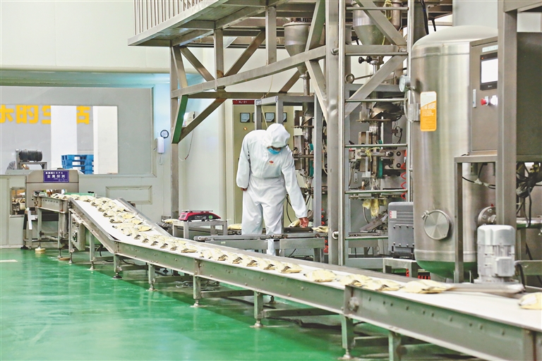 農(nóng)墾龍王食品公司車間的生產(chǎn)線正開足馬力運(yùn)轉(zhuǎn)。本報記者 張翎攝