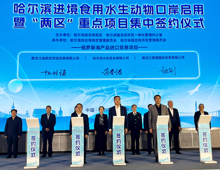 同日,哈爾濱進(jìn)境食用水生動(dòng)物口岸啟用暨“兩區(qū)”重點(diǎn)項(xiàng)目集中簽約儀式在哈爾濱臨空經(jīng)濟(jì)區(qū)舉行?!皟蓞^(qū)”一體化辦公室主任介紹了哈爾濱進(jìn)境食用水生動(dòng)物指定監(jiān)管場(chǎng)地和保稅航油項(xiàng)目基本情況。