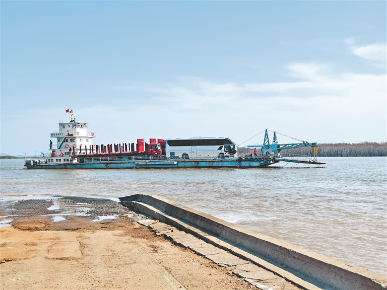 8時,首班輪渡船乘載著一輛中國客車和四輛中國貨車,經(jīng)饒河口岸夏季碼頭出境駛向俄羅斯波克羅夫卡口岸碼頭,標志著饒河口岸明水期客貨運輸正式通關(guān)。