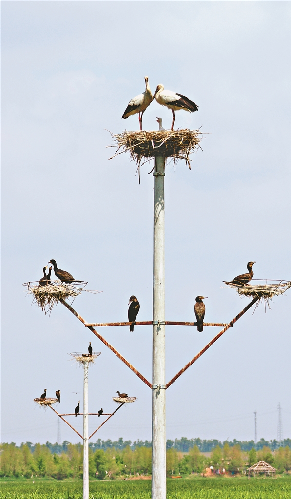 作為松花江流域保存完整、濕地多樣性特征顯著的天然遺跡,千鶴島濕地水草茂盛,魚類繁多,成為鳥類繁衍生息的天然場所。據(jù)風景區(qū)工作人員介紹,由于濕地內(nèi)植被資源保護完好,每年都吸引大量候鳥來此繁衍生活,且數(shù)量逐年增加。特別是今年搭建38個人工鳥巢后,濕地內(nèi)的東方白鸛數(shù)量達到300余只,成為國內(nèi)數(shù)量最多的棲息種群。