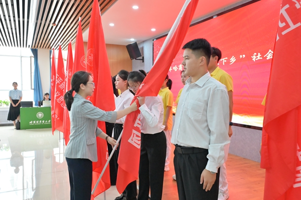 省希望工程捐助中心主任、省青少年發(fā)展基金會理事長杜晶為哈爾濱商業(yè)大學(xué)2024年“三下鄉(xiāng)”社會實(shí)踐團(tuán)隊(duì)代表、“情暖童心·鄉(xiāng)伴童行”支教團(tuán)代表授旗,希望即將奔赴龍江大地的志愿者們能夠充分利用服務(wù)期,向下扎根、向上生長,踐行志愿服務(wù)精神,在奉獻(xiàn)與收獲中積累報(bào)國為民的樸素情懷,做有理想、有擔(dān)當(dāng)?shù)男聲r代青年。