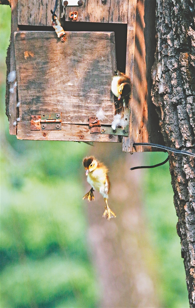 當(dāng)13只小鴛鴦跳完,最后一只卡在木頭縫隙中遲遲下不來(lái),鳥(niǎo)媽媽帶著其他孩子在鴛鴦池塘上焦急地向巢上眺望,不時(shí)發(fā)出“咳、咳”的叫聲,召喚它快些跳下來(lái)。在一番“手蹬腳刨”后,這只身體有些單薄的小家伙終于掙脫而出,飛身躍到池塘邊的臺(tái)階上,然后再躍身跳到池塘里游到媽媽身邊。