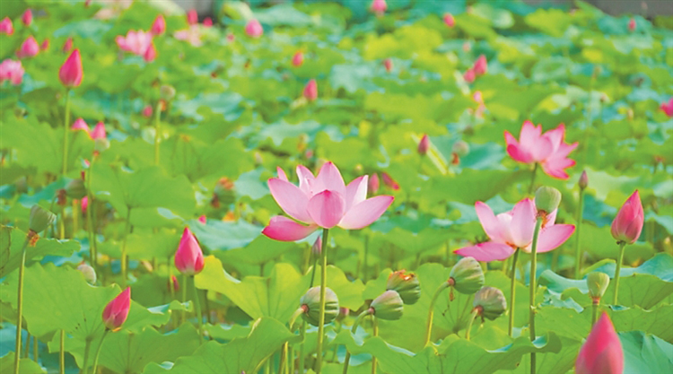 在北大荒集團(tuán)八五九農(nóng)場(chǎng)有限公司灌渠附近,眾人發(fā)現(xiàn)了一片美若仙境的荷花泡,粉色的花朵連成一片,遠(yuǎn)遠(yuǎn)望去燦若朝霞,香味彌漫周?chē):苫ǔ刂?,綠葉如蓋,朵朵荷花從中脫穎而出,花瓣層層疊疊,錯(cuò)落有致,宛如精心雕琢的藝術(shù)品,每一朵都蘊(yùn)含著大自然的鬼斧神工。