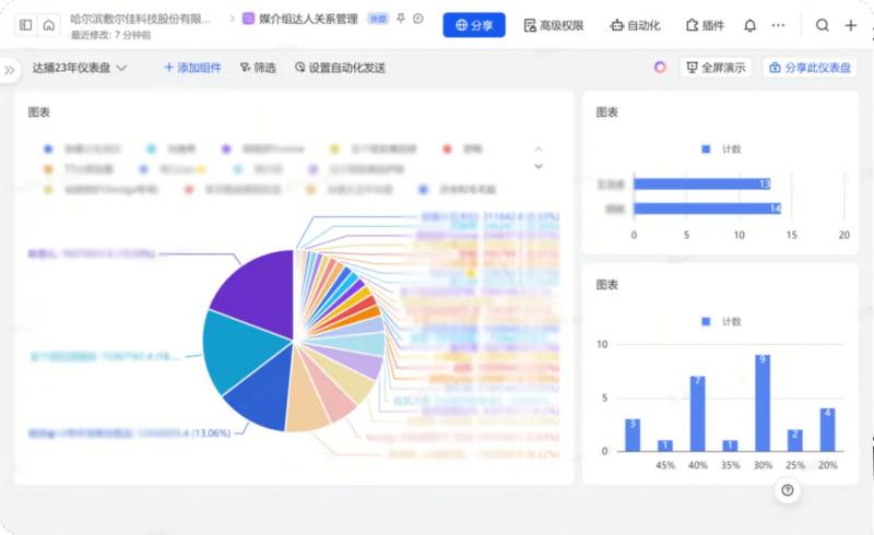 由于器械字號(hào)產(chǎn)品的特殊性,現(xiàn)在敷爾佳通過(guò)飛書(shū)在線文檔審批達(dá)人,將達(dá)人數(shù)據(jù)填寫上報(bào),上級(jí)在線同步審批達(dá)人,跟進(jìn)確定合作。直播中,用飛書(shū)云盤儲(chǔ)存資料,將達(dá)播錄屏,產(chǎn)品資料等數(shù)據(jù),同步云盤,方便各部門查看,調(diào)取相關(guān)資料。直播后,利用飛書(shū)多維表格將達(dá)人信息,合作傭金,產(chǎn)出 GMV,對(duì)接人等重要信息歸攏一起,形成多維表格方便組織內(nèi)互相查閱填寫, 通過(guò)儀表盤的功能體現(xiàn)出哪些達(dá)人是優(yōu)質(zhì)合作達(dá)人,并為二次投放合作提供了參考價(jià)值。