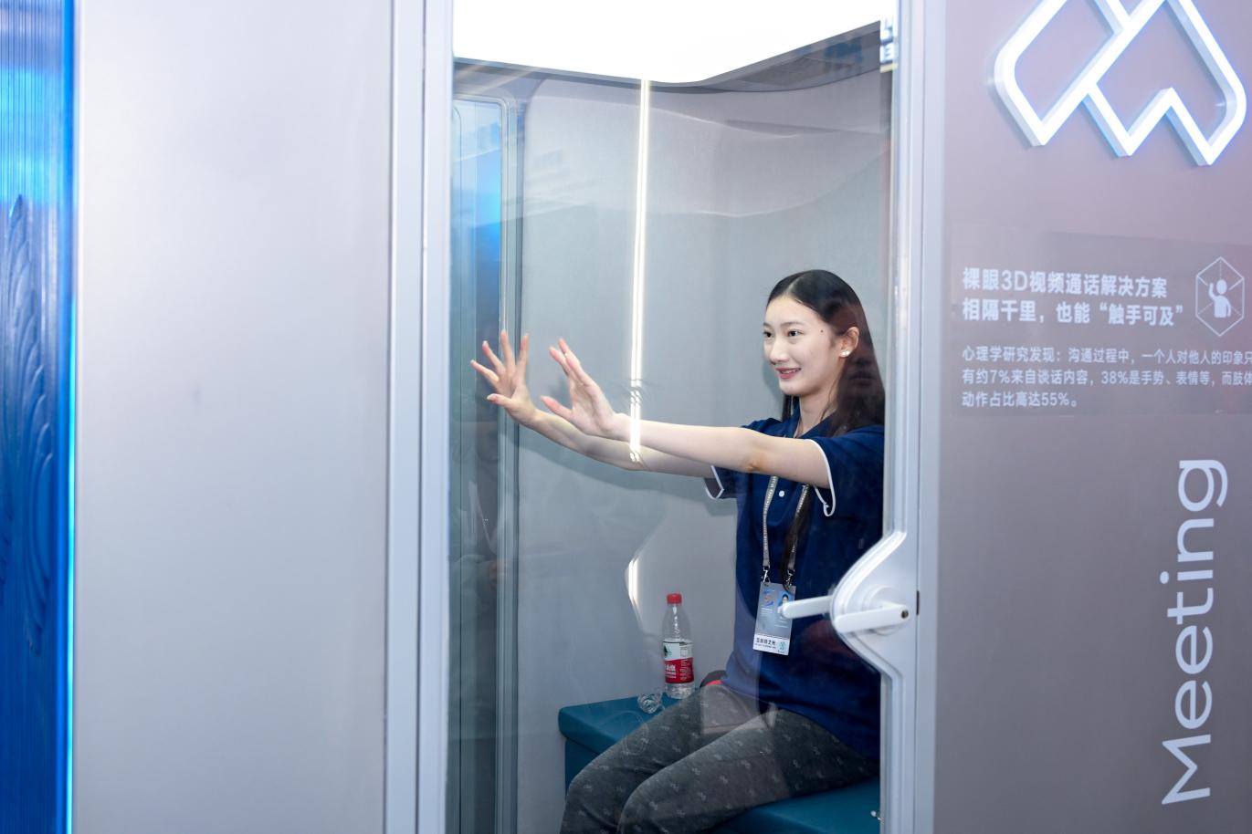 圖為參觀者體驗(yàn)騰訊會(huì)議裸眼3D通話艙